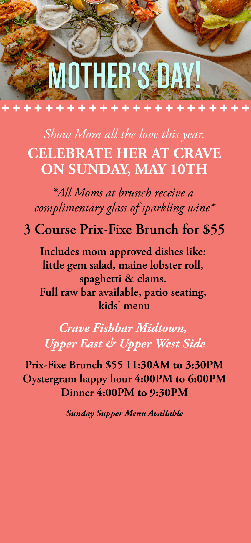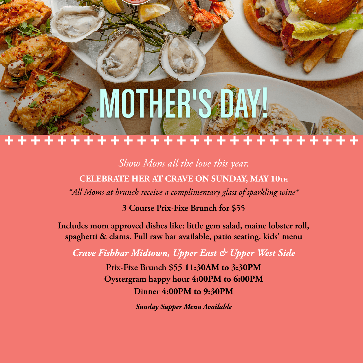 Crave Fishbar—NYC’s first 100% sustainable seafood restaurant—is home to the #Oystergram Happy Hour, NYC’s best oyster happy hour deal. At home in Midtown East and the Upper West Side, we serve creative seafood in an upscale neighborhood setting, complete with warm hospitality. Global flavors and innovative preparations highlight our sustainable seafood, heritage meats, and organic produce. Our raw bar features a daily selection of east and west coast oysters, sometimes up to twenty varieties each night. For business dinners, special occasions, and dining out just-because, we’re here to serve you a sustainable and memorable meal.